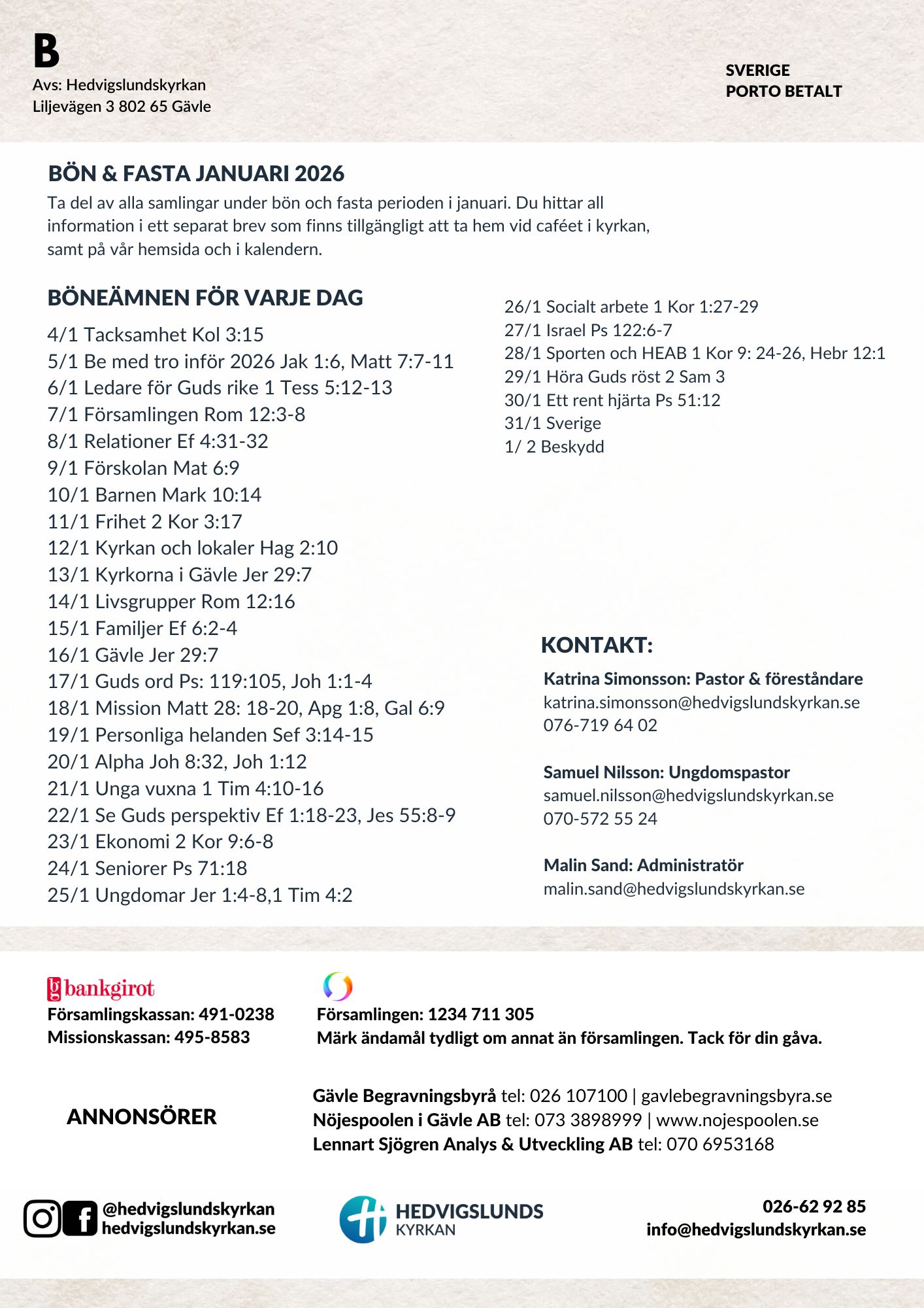 Månadsbrev sida 2 Visa större bild malinhammarberg6d61c7e6852025-12-18T12:57:59+01:00 Relaterade inlägg Sopplunch Sopplunch 17.02.2026 Månadsbrev sid 2 Månadsbrev sid 2 29.01.2026 Månadsbrev sid 1 Månadsbrev sid 1 29.01.2026 Barn- och familjekonferens sön 8/2 Barn- och familjekonferens sön 8/2 15.01.2026 Alphakurs och Alpha Bönekurs Alphakurs och Alpha Bönekurs 13.01.2026